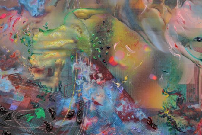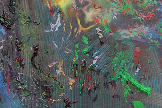 Acrylic, gel, gouache, charcoal, graphite, glass, mica, holographic film, hair, volcanic ash (Mount Pinatubo 1991 eruption, Philippines) digital print