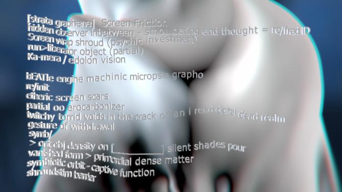 A virtual ka-mera scans a phantom shrouded figure in an anechoic chamber. Linear text bursts into an asignifying swarm where the letter C escapes and descends into a presignifying regime, breaks free from its carapace/shroud and mutates into primitive biological forms and mark making.